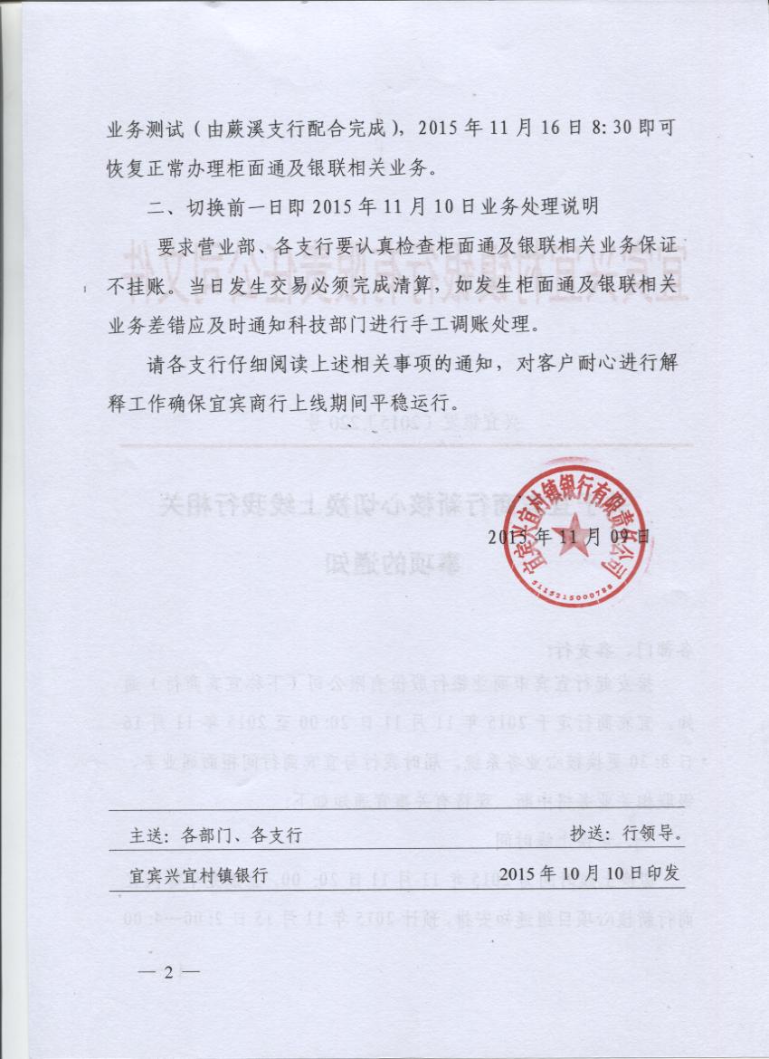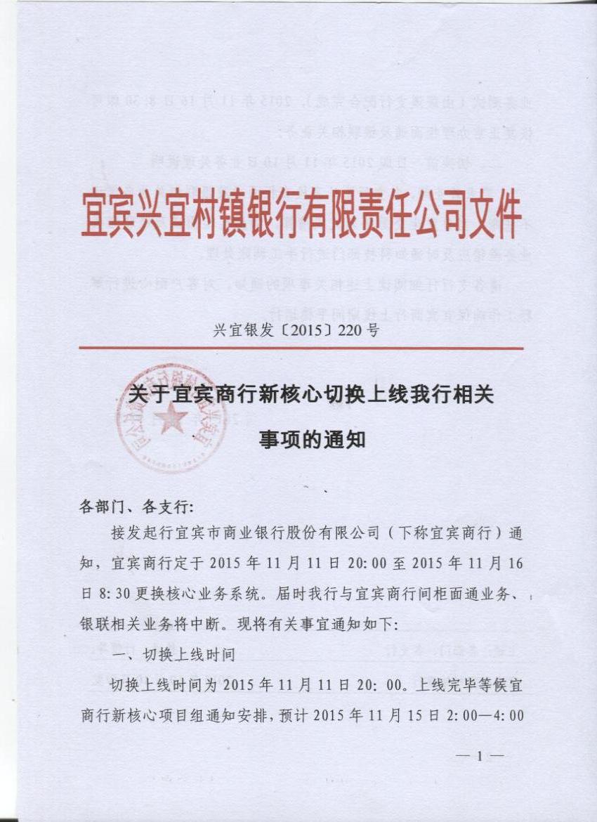 接發(fā)起行宜賓市商業(yè)銀行股份有限公司(下稱宜賓商行)通知,宜賓商行定于2015年11月11日20:00至2015年11月16日8:30更換核心業(yè)務系統(tǒng)。屆時我行與宜賓商行間柜面通業(yè)務以及銀聯(lián)相關業(yè)務將中斷。